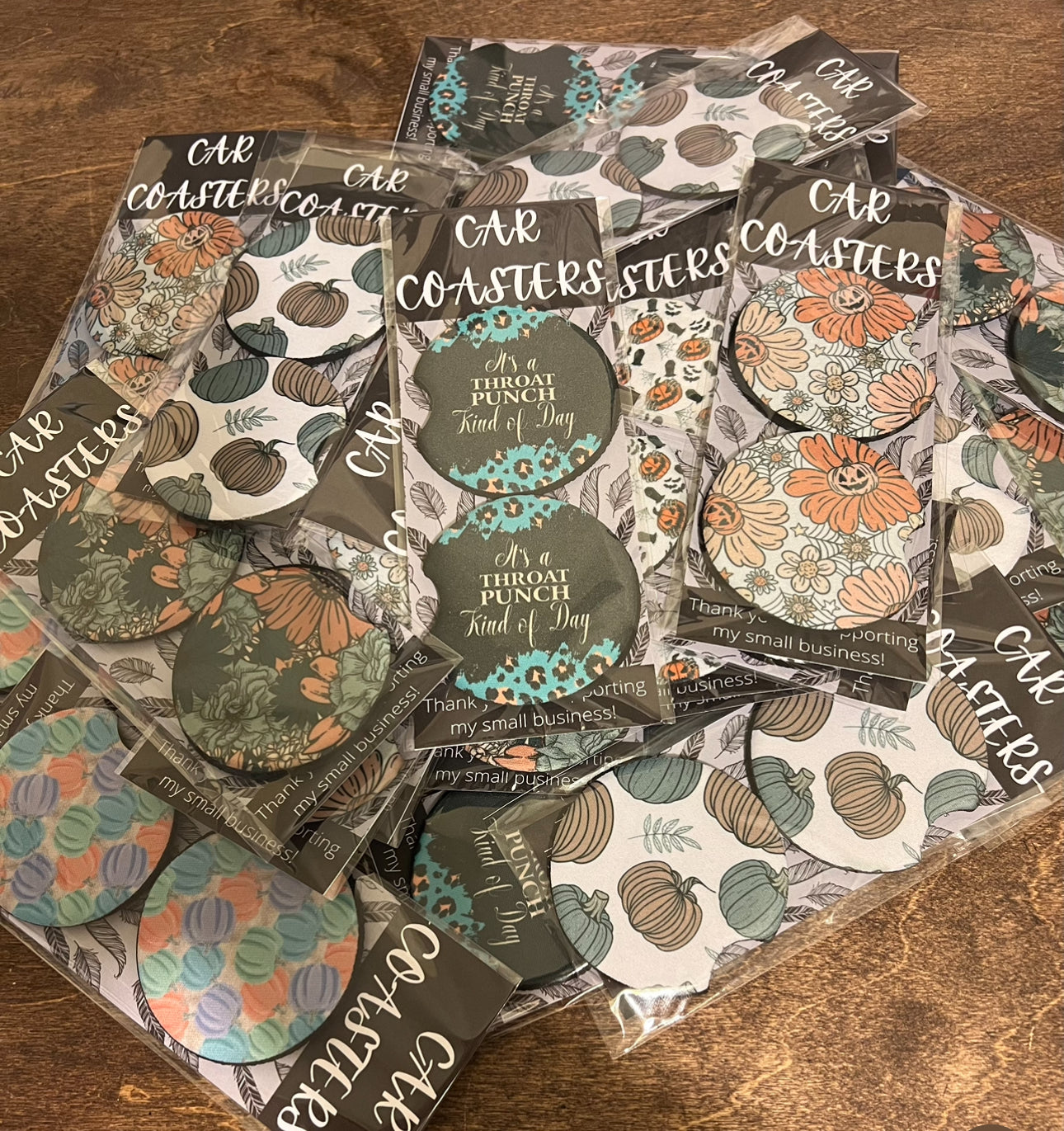 Included: This includes a pair of car coasters, individually packaged in non-branded packaging and ready to sell.